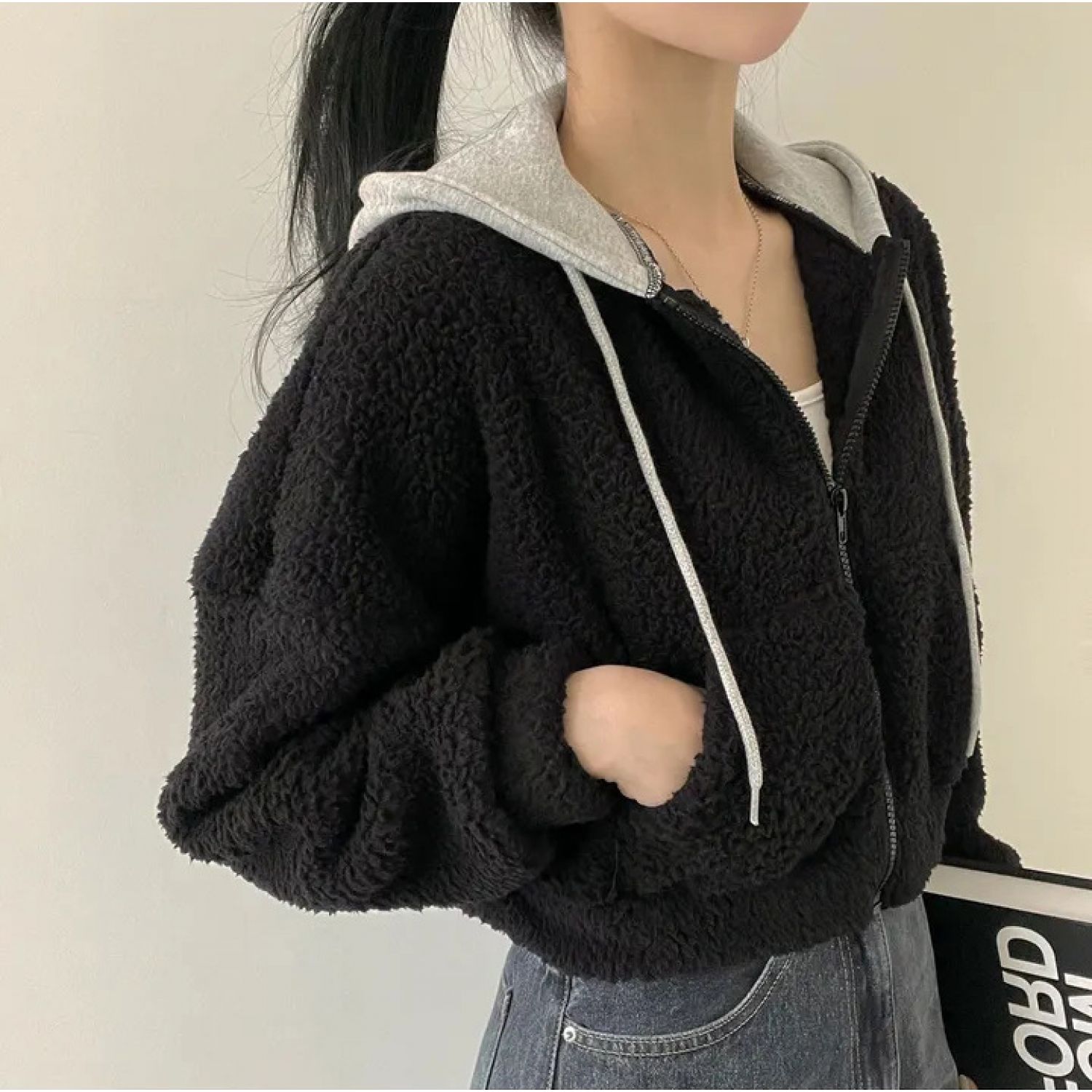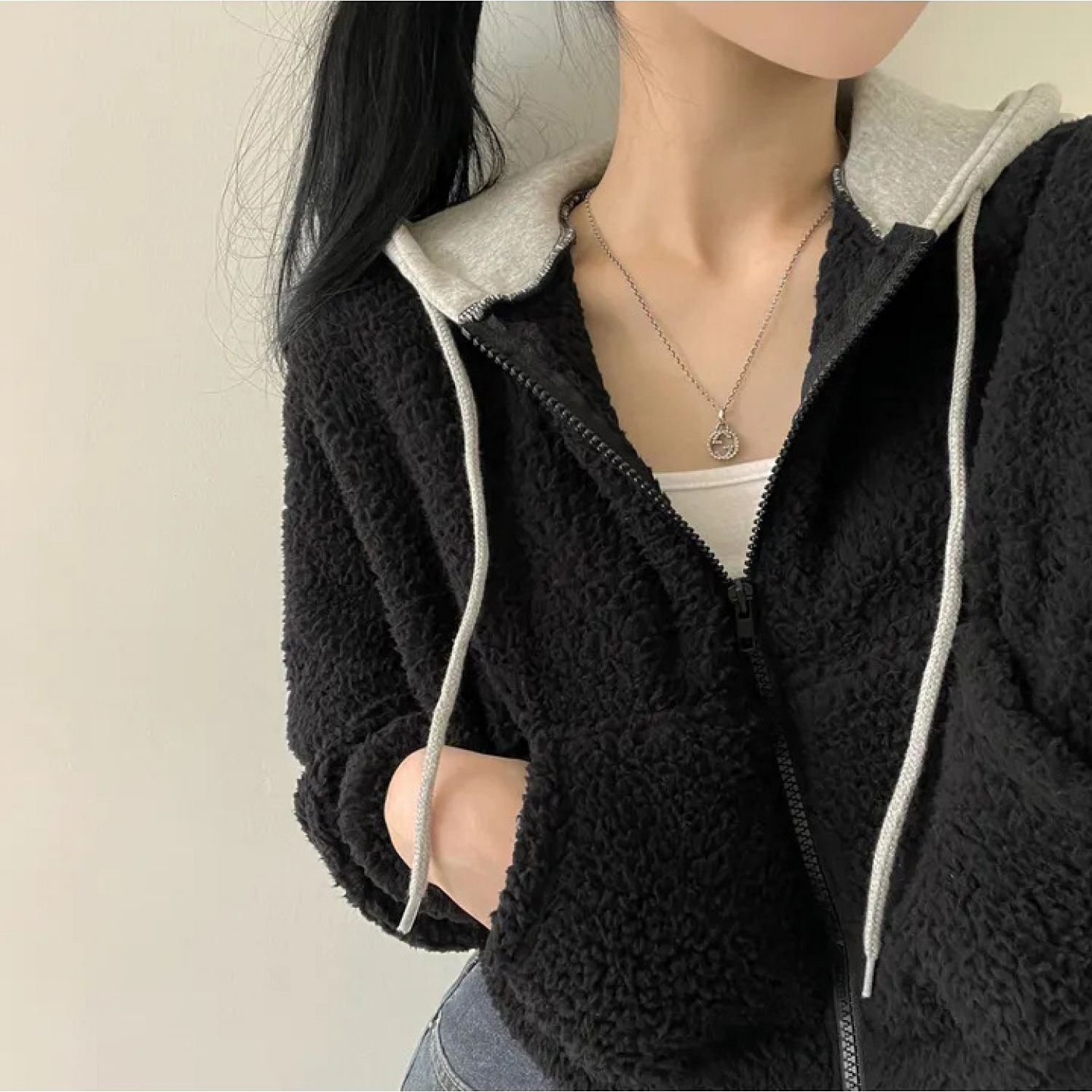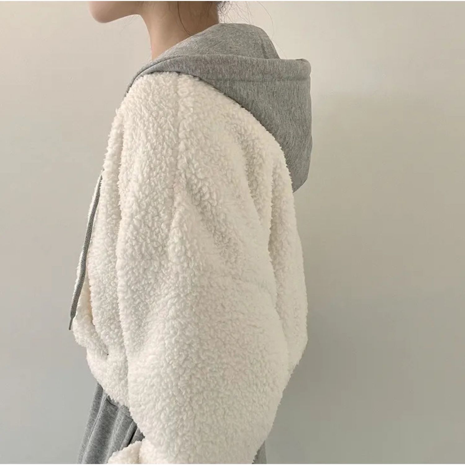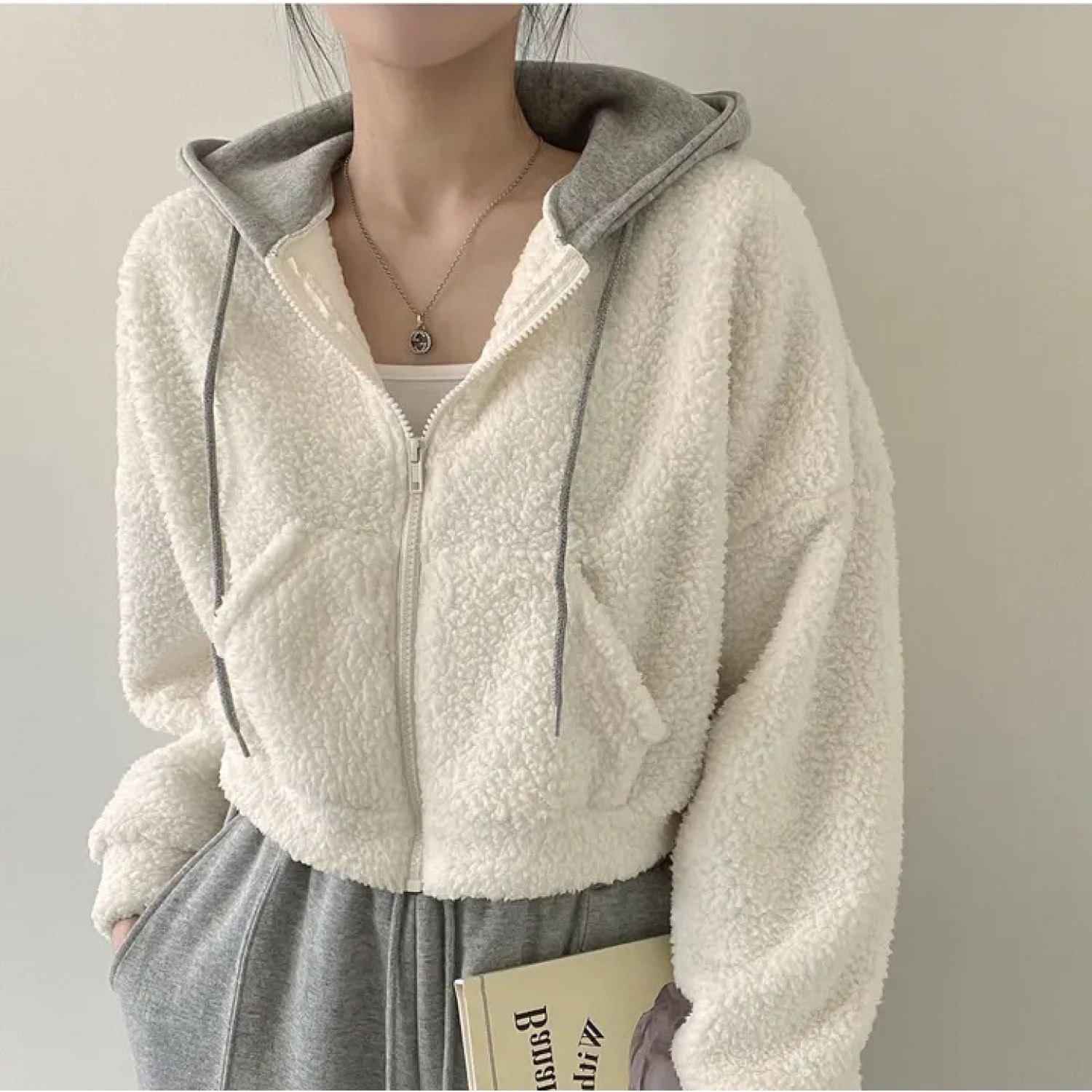 Warm Leisure Sports Loose Lamb Fur Hooded Pocket Small Plush Coat Beige S
