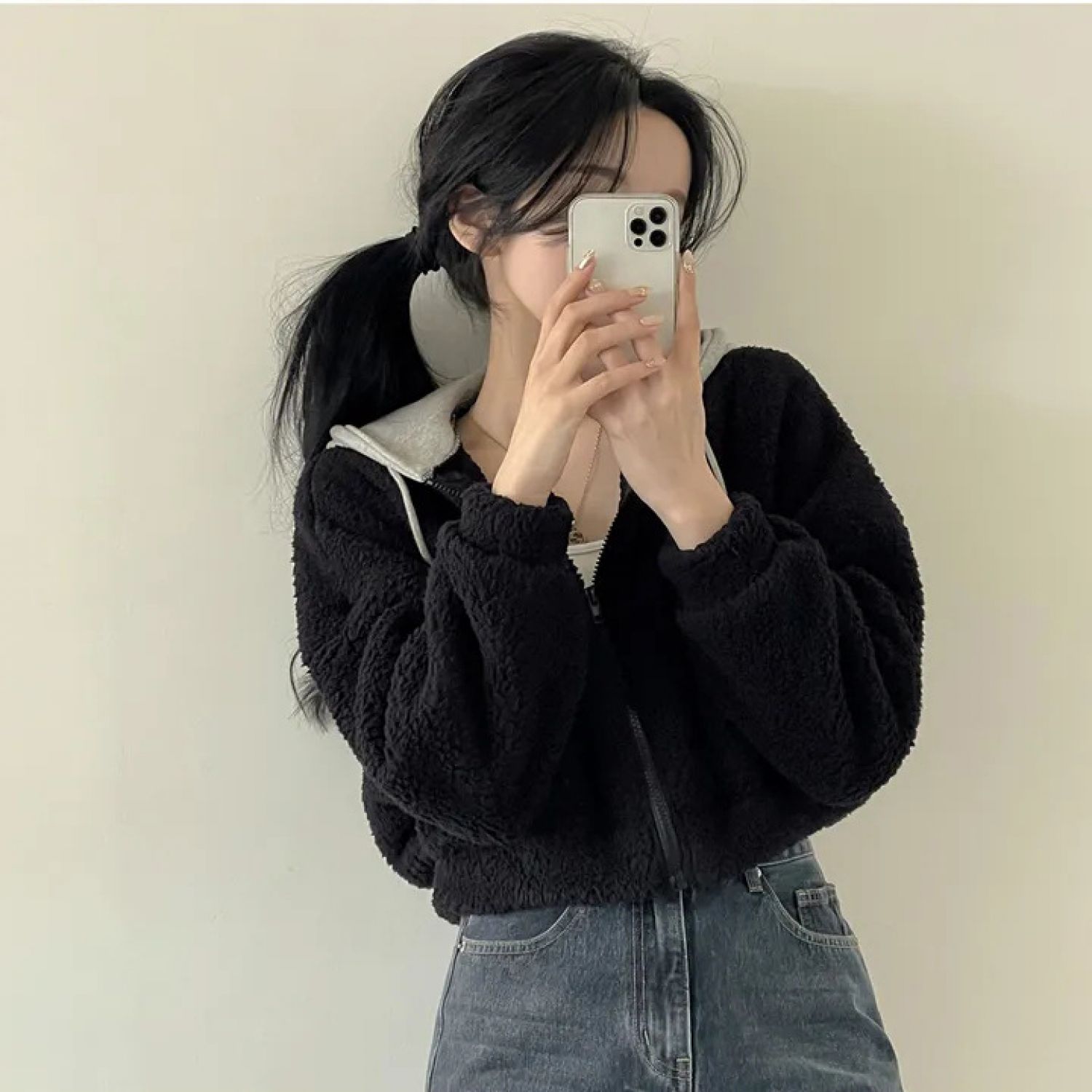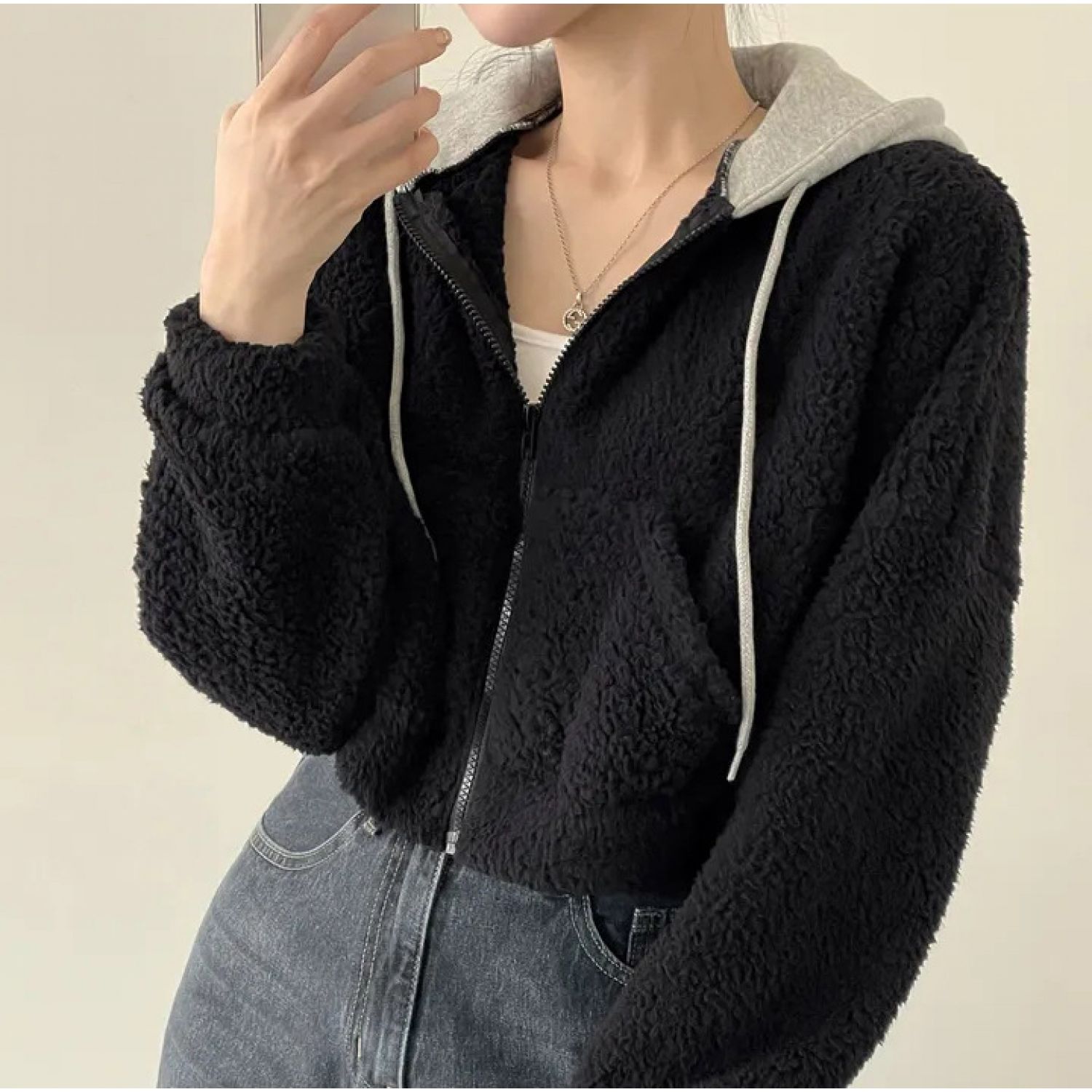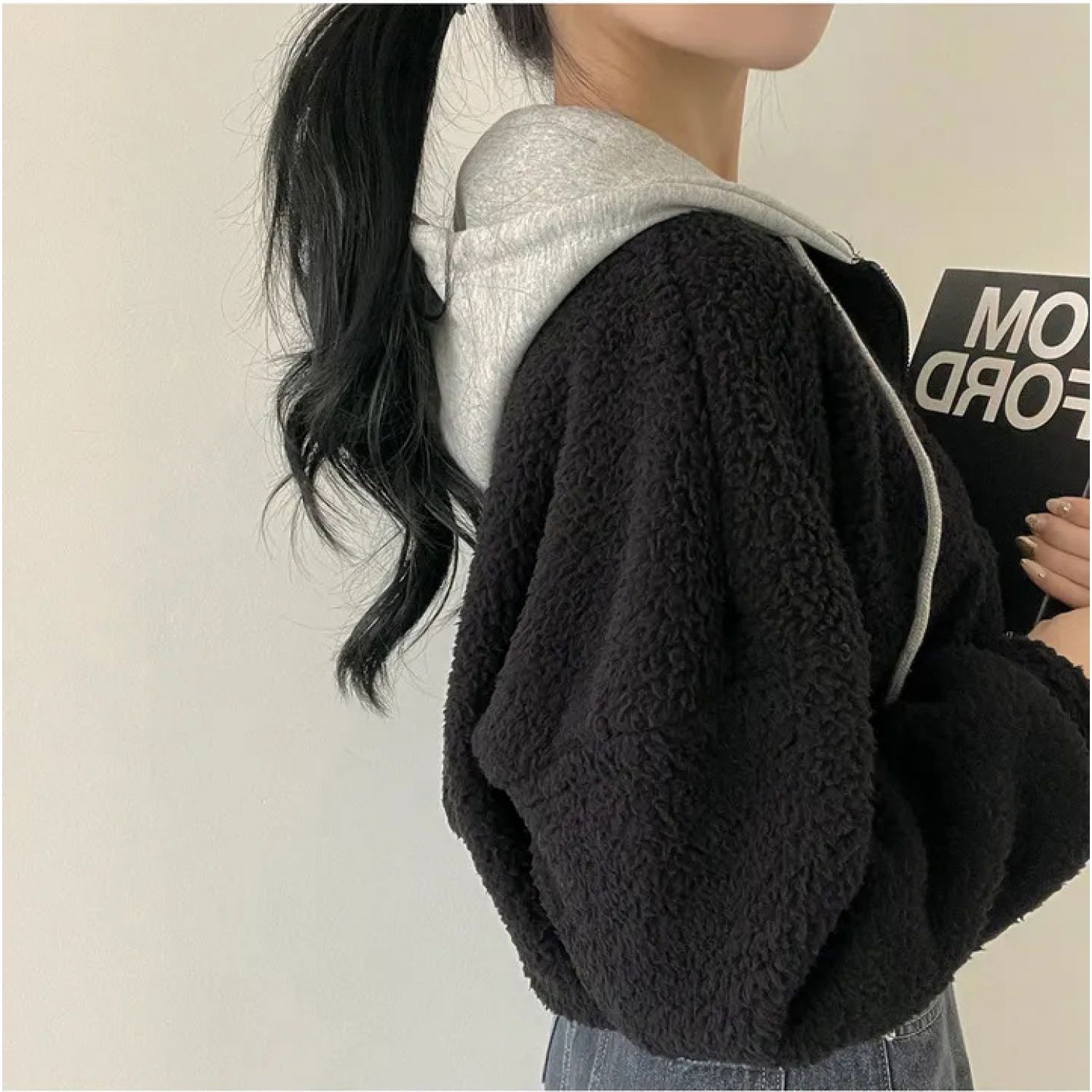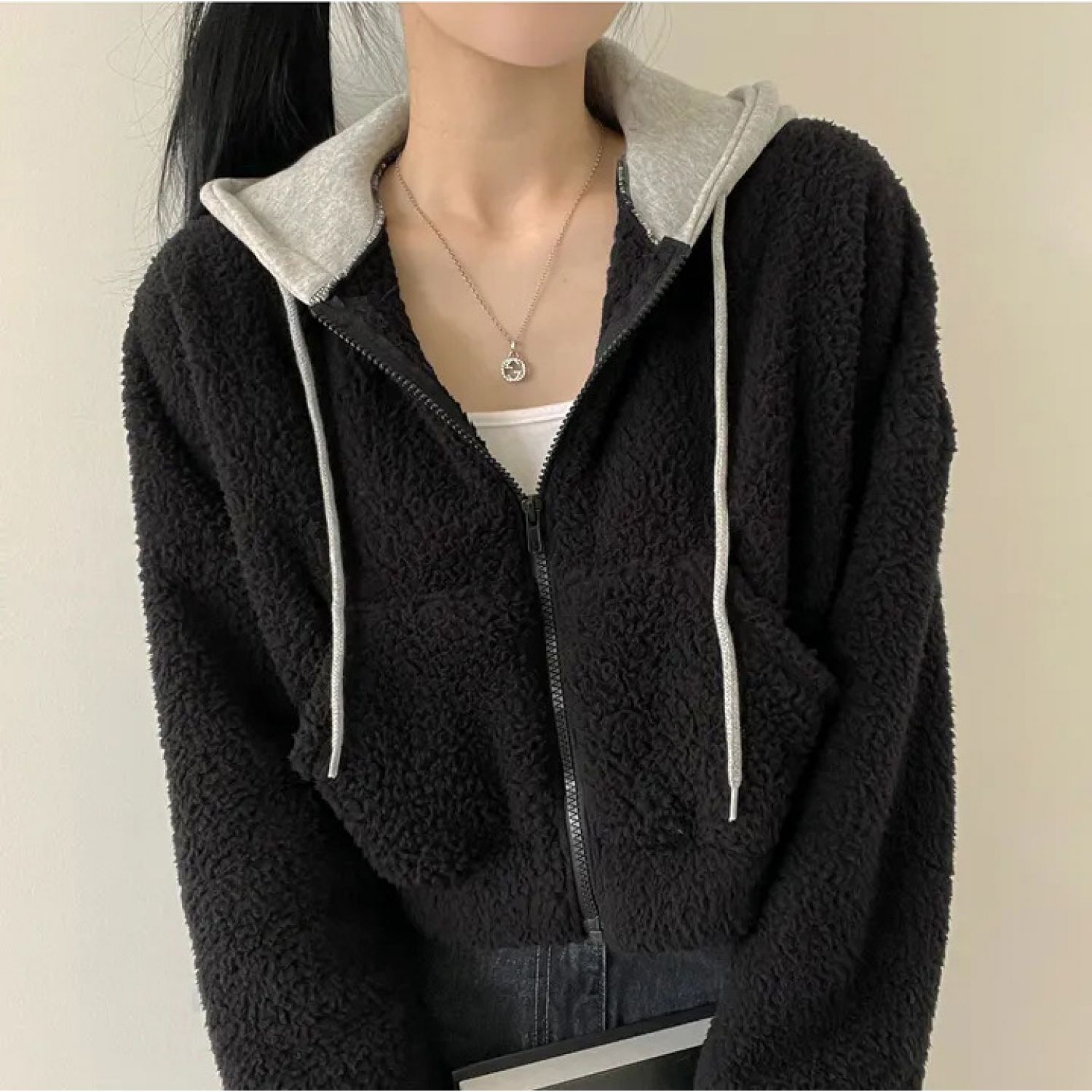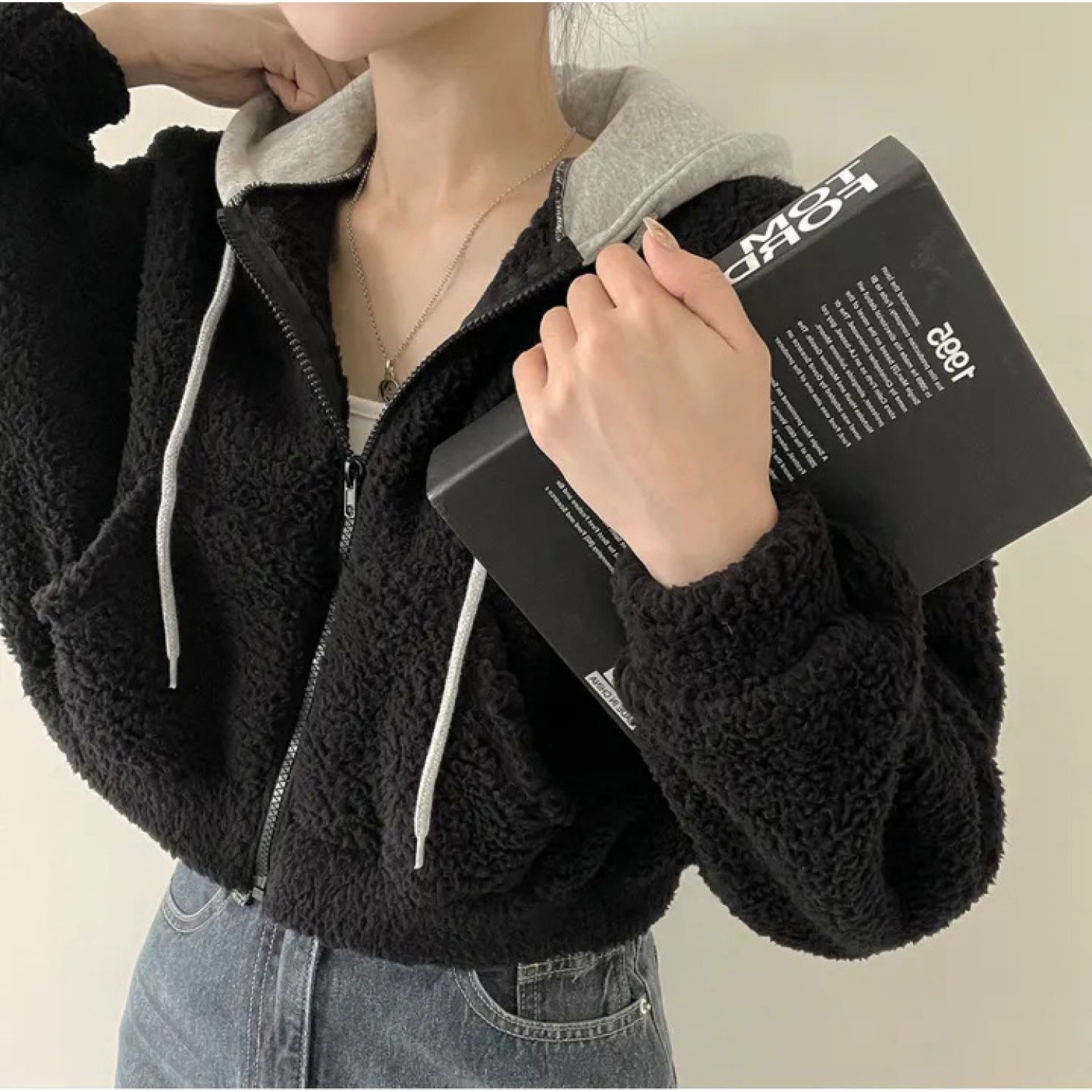 Warm Leisure Sports Loose Lamb Fur Hooded Pocket Small Plush Coat Beige S