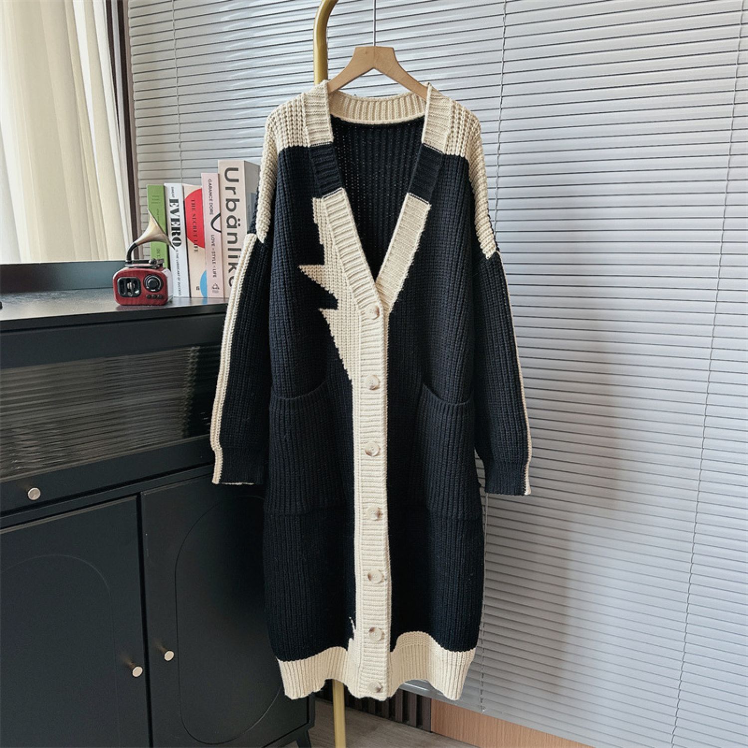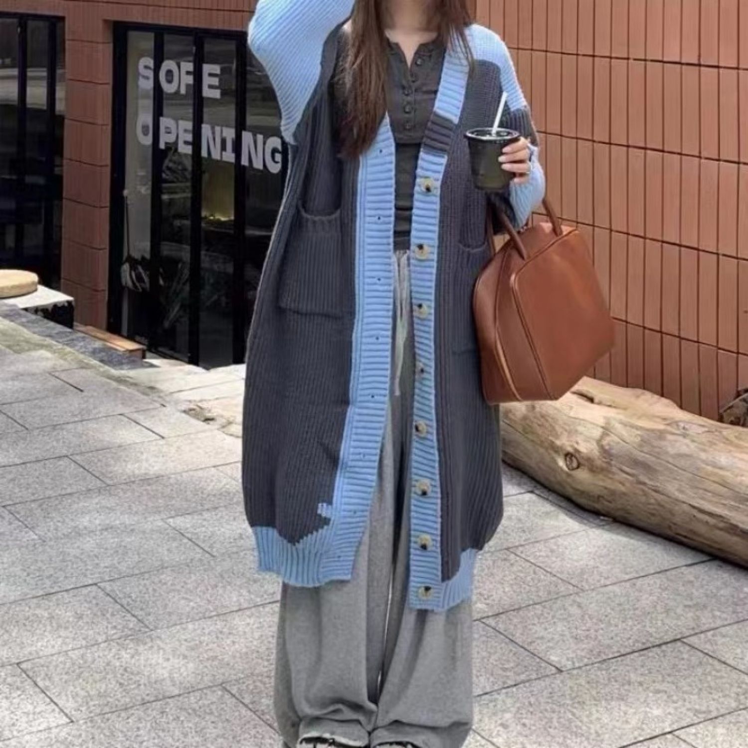 Women's Fashionable All-match Contrast Color Knitted Coat Blue Free Size