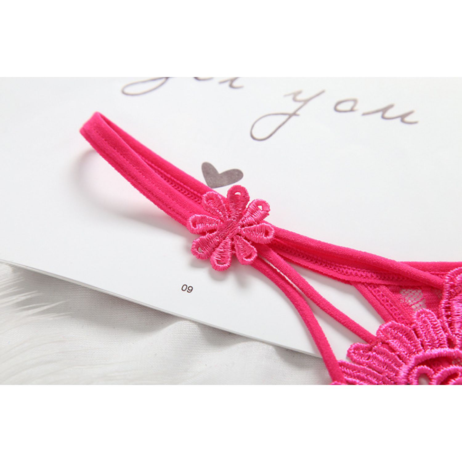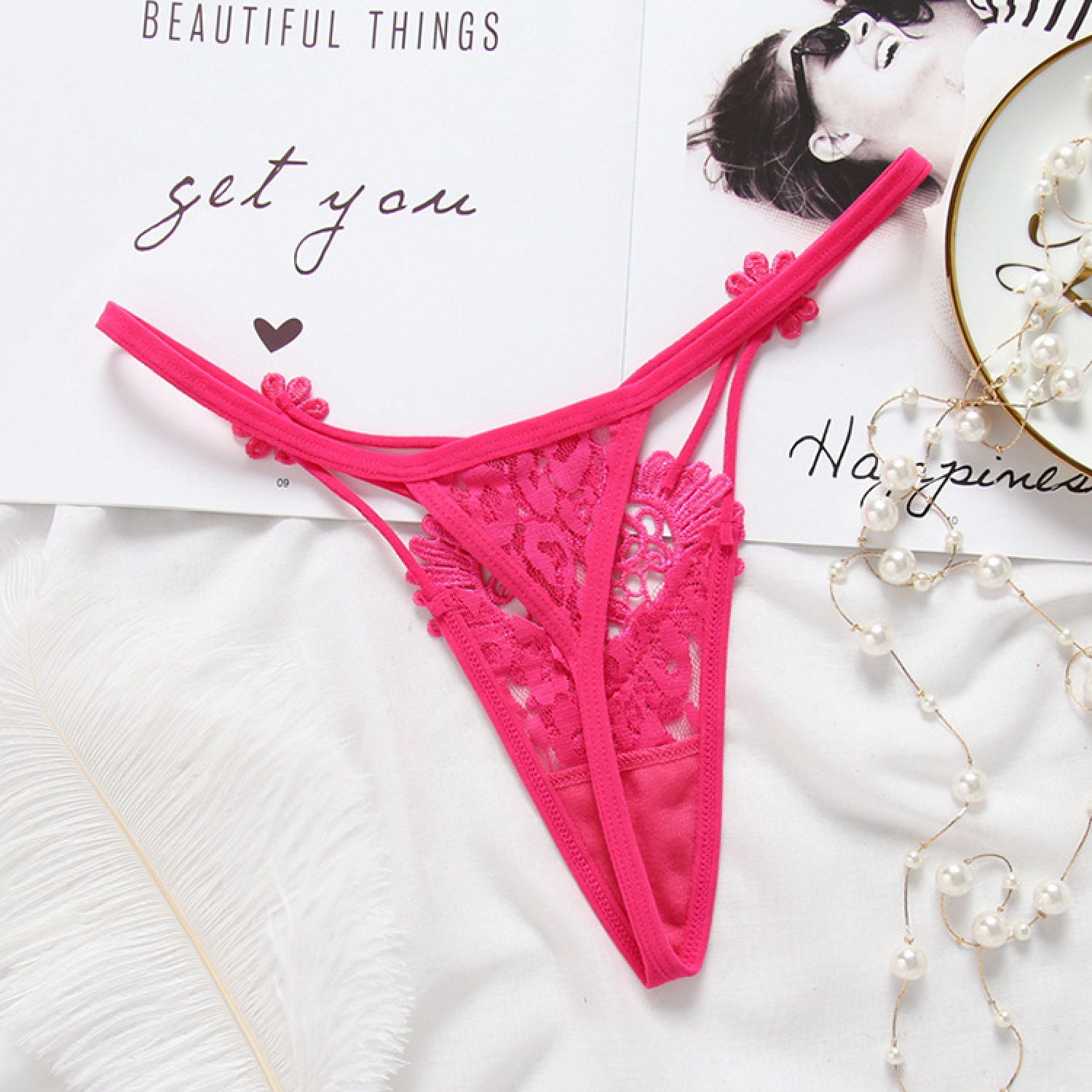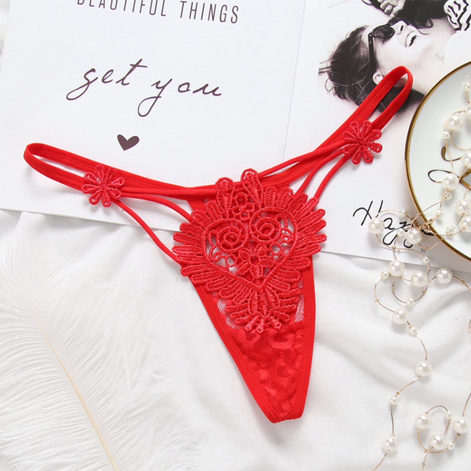 Women's Hollow Low Waist Water Soluble Flower Embroidery T-back Underwear Red Free Size