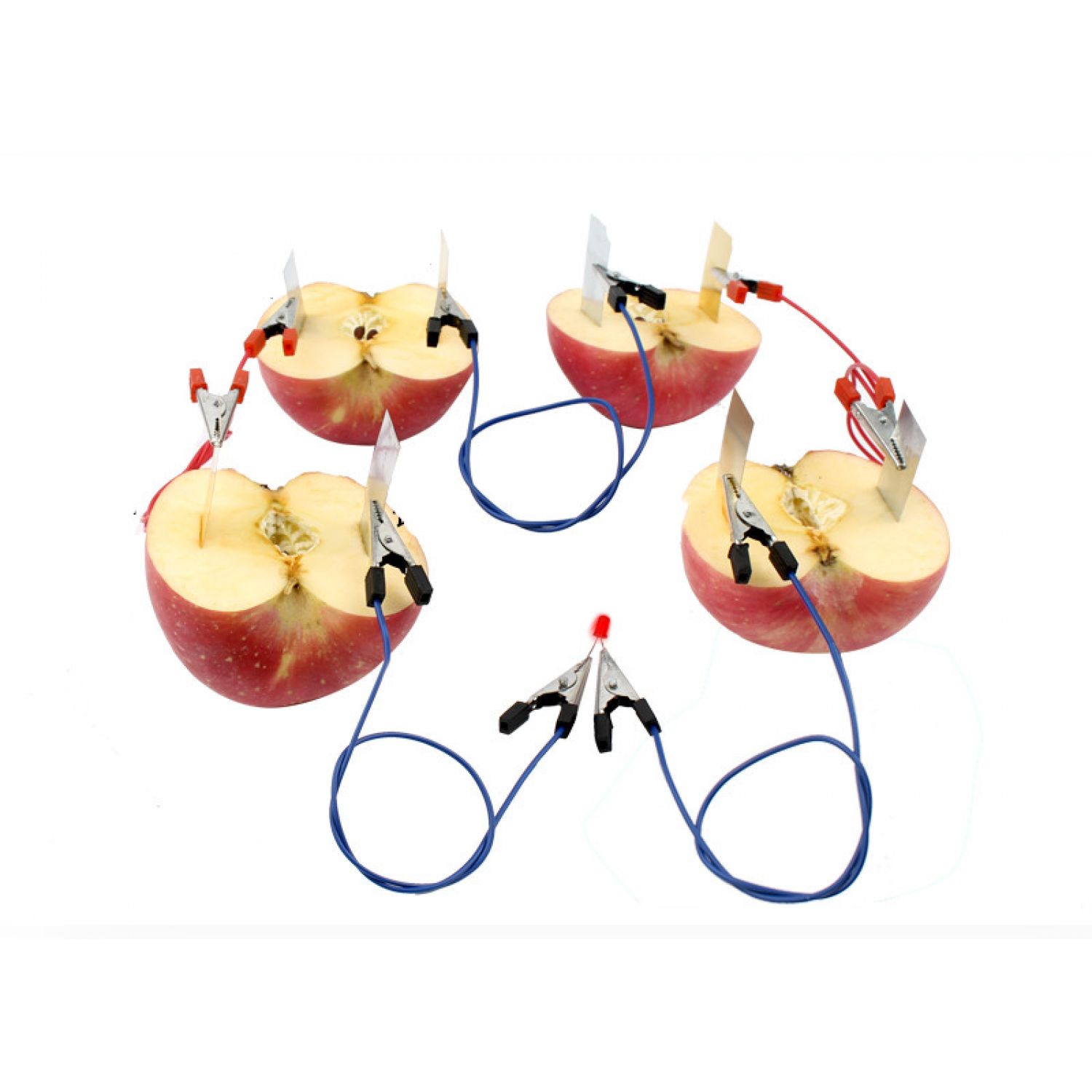 In the experiment, the two different metal pieces must have a certain distance and cannot touch each other. Two pieces of metal on a wire cannot be placed in the same fruit.