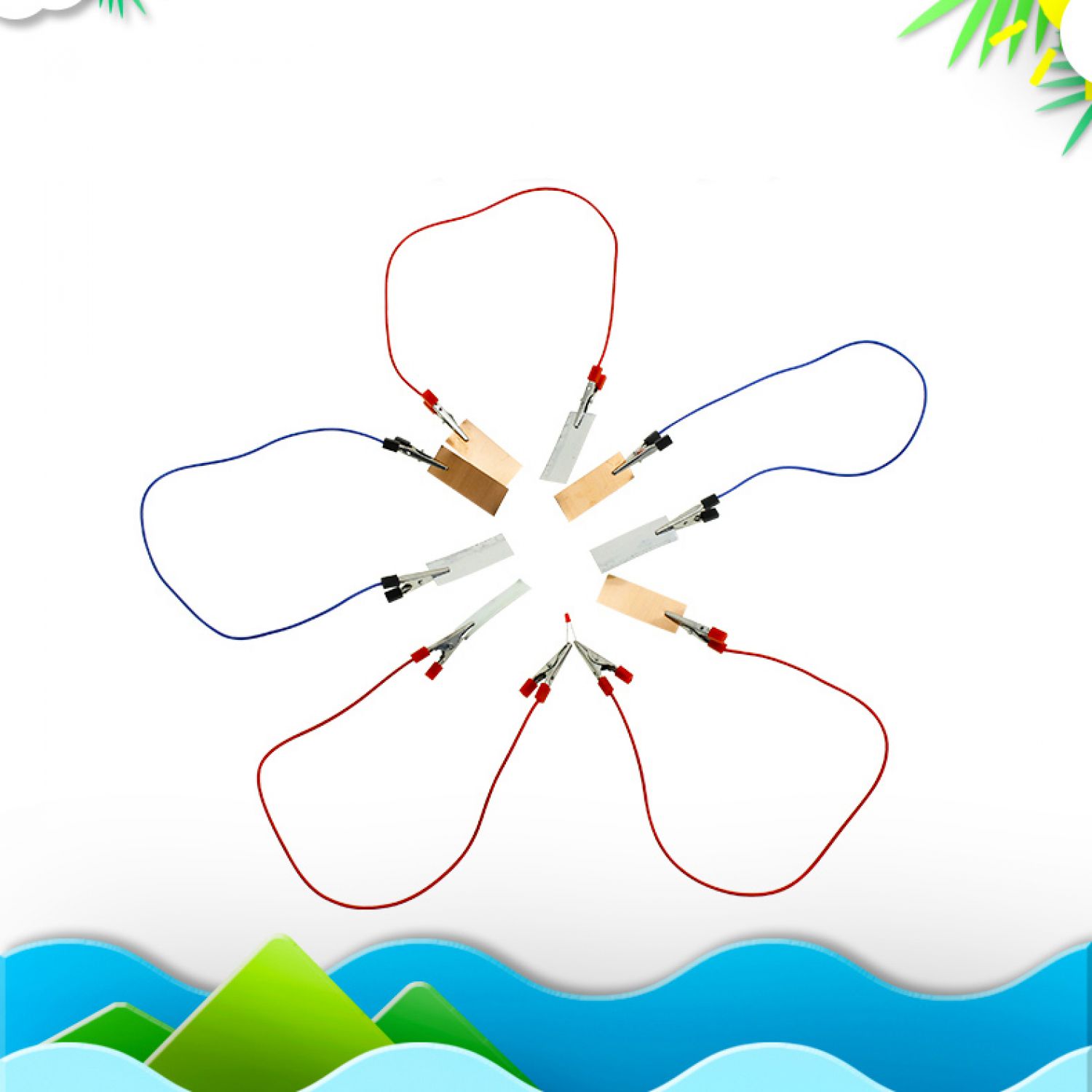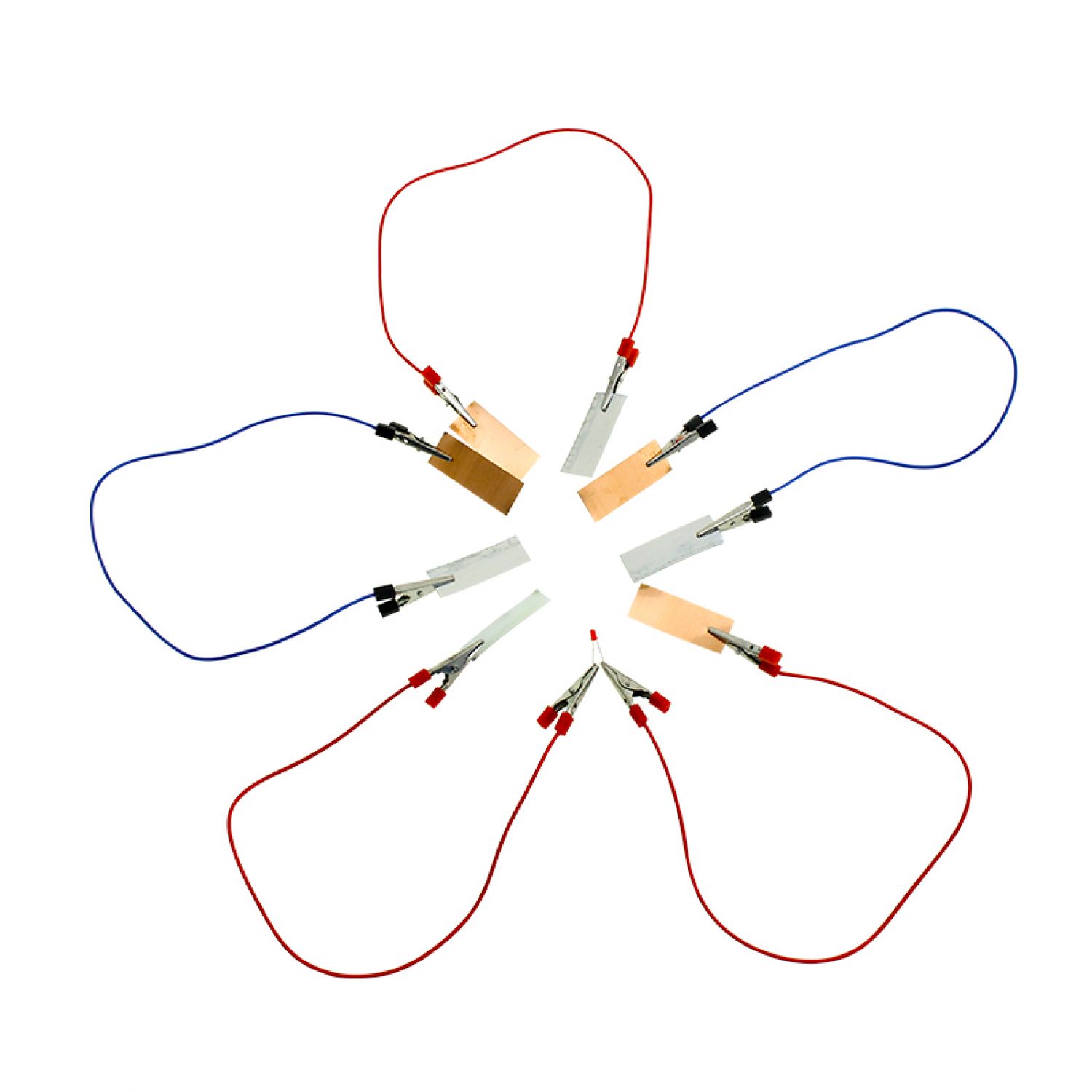 One end of the alligator clip is connected to a copper piece of fruit, and the other end is connected to a zinc piece of another fruit; the two alligator clips connected to the diode cannot touch each other.